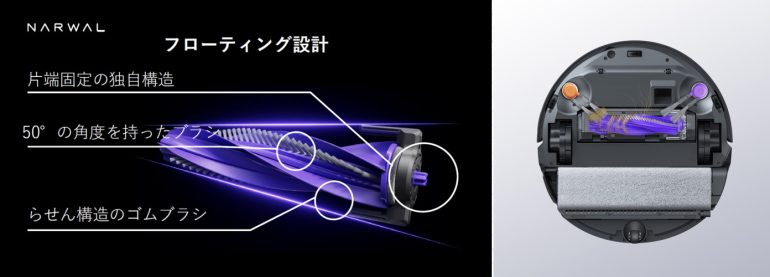 Narwalのフローティングローラーブラシは、片側しか固定されていない独自構造、50度の角度で斜めに生えているブラシ、螺旋構造のゴムブラシの3つにより、毛が絡むことなくスムーズに移動するような仕組み。フローティング側に吸引口があるため、絡みついた髪の毛はすべて吸引口に誘導されるような設計になっている。