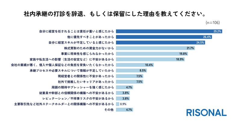 社内承継を辞退・保留した理由は、「責任が重いと感じた」が29.2%で最多となり、以下「他に優先すべきことがあった」が26.4%、「経営スキル不足」が24.5%と続いた。重責への心理的負担と能力不足への不安が、承継の大きな障壁となっていることがうかがえる。