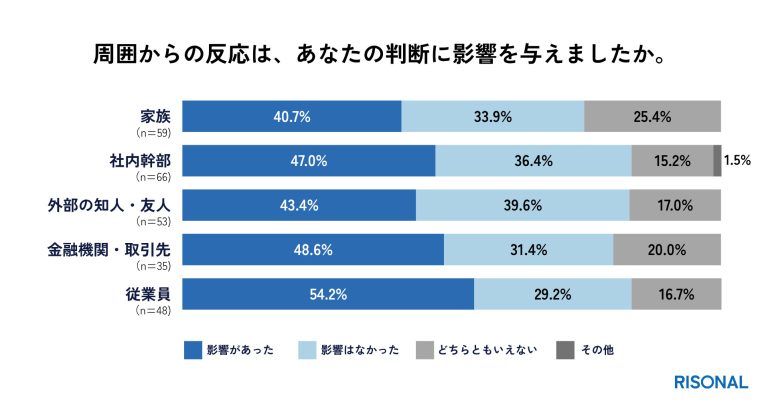 前回調査の「会社を継いだ後継者」と比較すると全体的に高い傾向が見られ、特に日頃から業務上で関わりのある社内外の関係者の反応が、判断に影響を与えやすいことが明らかになった。