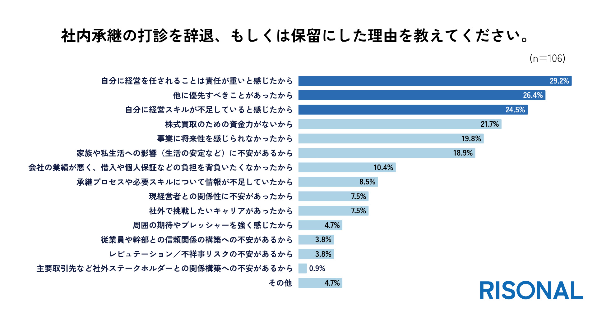 社内承継を辞退・保留した理由は、「責任が重いと感じた」が29.2%で最多となり、以下「他に優先すべきことがあった」が26.4%、「経営スキル不足」が24.5%と続いた。重責への心理的負担と能力不足への不安が、承継の大きな障壁となっていることがうかがえる。