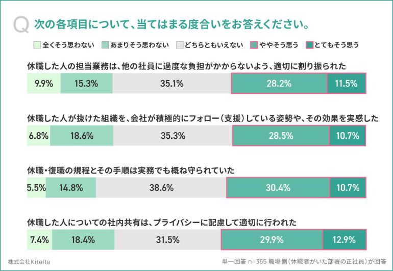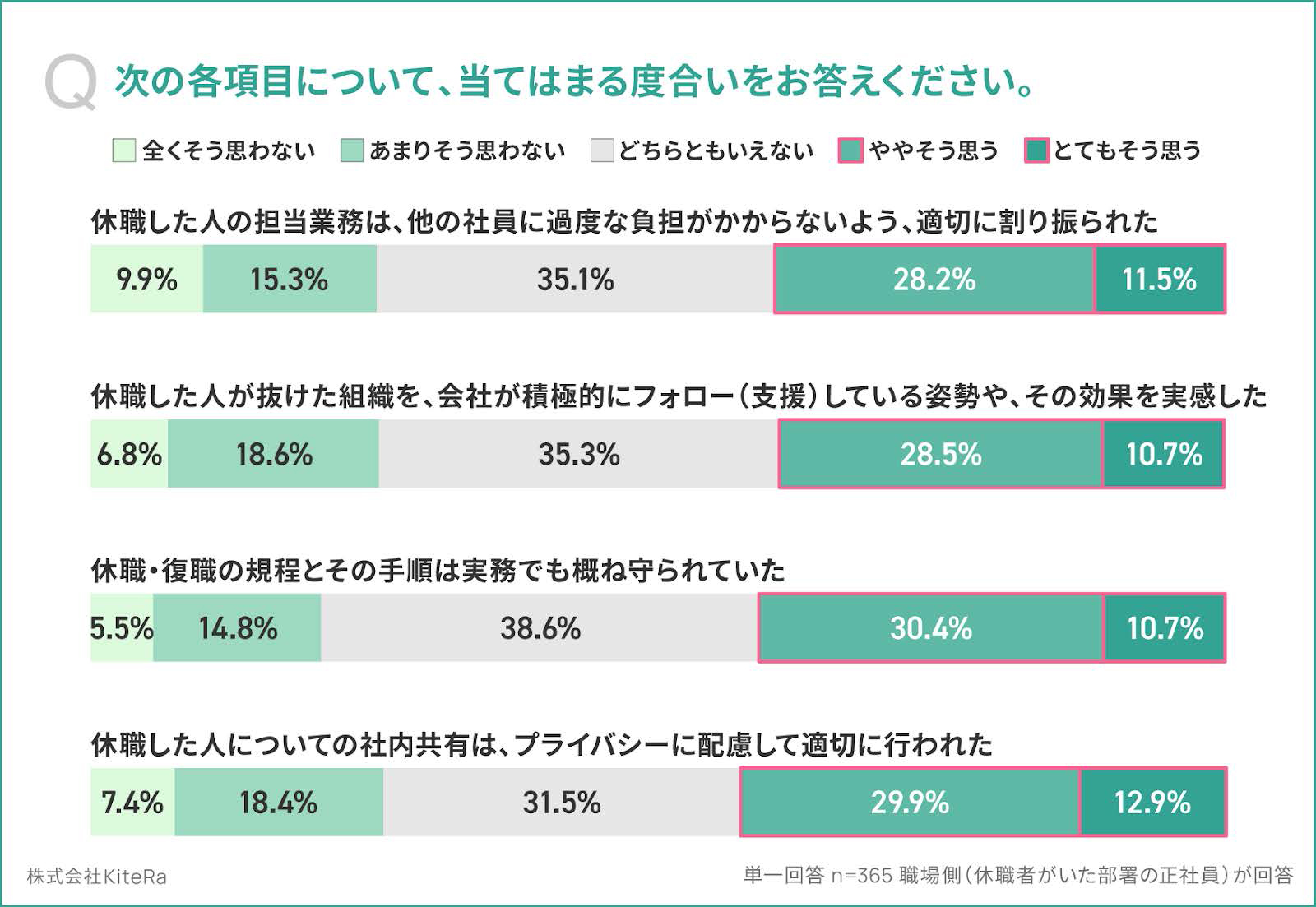 職場側である休職者がいた部署の正社員に、休職者に関連する会社側の取り組みについての評価を質問したところ、「休職した人の担当業務は、ほかの社員に過度な負担がかからないよう、適切に割り振られたと思いますか」に対しての肯定(ややそう思う/とてもそう思う)は39.7%、 「休職した人が抜けた組織を会社が積極的にフォロー(支援)している姿勢やその効果を実感しましたか」に対しての肯定(ややそう思う/とてもそう思う)は39.2% 、「休職・復職の規程とその手順は実務でも概ね守られていましたか」に対しての肯定(ややそう思う/とても そう思う)は41.1%、「休職した人についての社内共有は、プライバシーに配慮して適切に行われたと思いますか」に対しての肯定(ややそう思う/とてもそう思う)は42.8%だった。