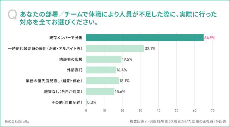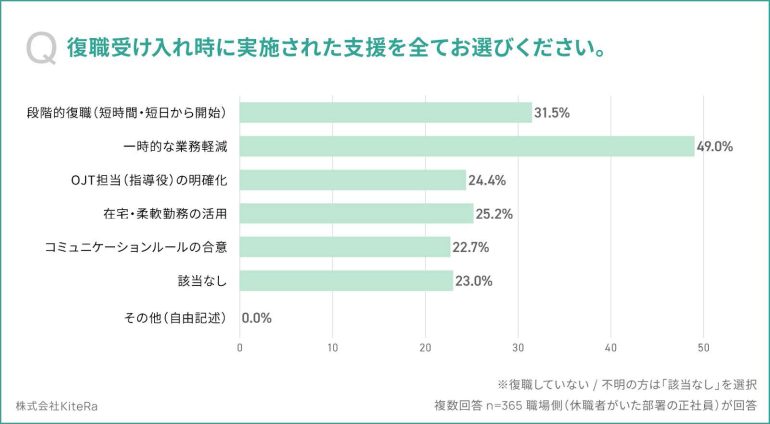 「あなたの部署/チームで休職により人員が不足した際に実際に行った対応をすべてお選びください(複数回答)」という質問に対しは、もっとも多かったのは「既存メンバーで分担」(64.9%)だった。続いて「一時的代替要員の雇用(派遣・アルバイト等)」が32.1%、「他部署の応援」 が19.5%で、「施策なし(各自が対応)」と回答した人は15.6%だった。「復職受け入れ時に実施された支援をすべてお選びください(複数回答)」という質問では、もっとも多かったのは「一時的な業務軽減」が49.0%で、次いで「段階的復職(短時間・短日から 開始)」が31.5%、「在宅・柔軟勤務の活用」が25.2%という結果だった。