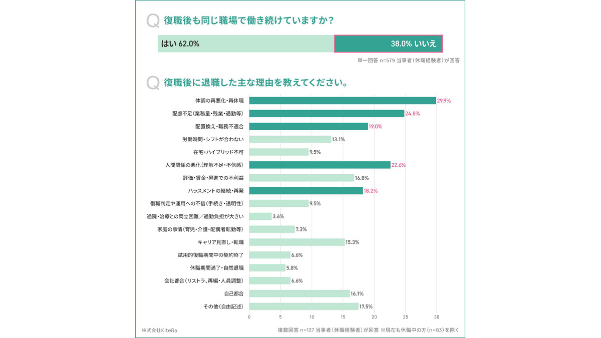 休職経験者に「復職後も同じ職場で働き続けていますか(過去5年以内の休職経験者・正社員)」と質問すると、「はい」が62.0%、「いいえ」が38.0%だった。復職後に退職した人の「復職後に退職した主な理由(複数回答)」については、回答が多い順に「体調の再悪化・再休職」(29.9%)、「配慮不足(業務量・残業・通勤等)」(24.8%)、「人間関係の悪化(理解不足・不信感)」(22.6%)、「ハラスメントの継続・再発」(18.2%)というランキングになった。