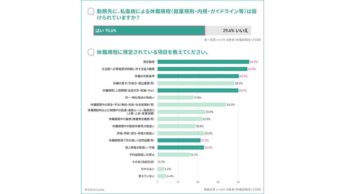 休職経験者に「勤務先に私傷病による休職規程(就業規則・内規・ガイドラインなど)は設けられていますか」と質問すると、「はい」が70.6%、「いいえ」 が29.4%だった。休職規程が「ある」と回答した人に「休職規程に規定されている項目を教えてください(複数回答)」と質問すると、回答が多い順に「受診勧奨」(45.5%)、「主治医への情報提供依頼に対する協力義務」(44.5%)、「休職の判断基準」(40.3%)、「休職期間(上限期間・延長可否・短縮・中止)」(40.1%)という結果になった。