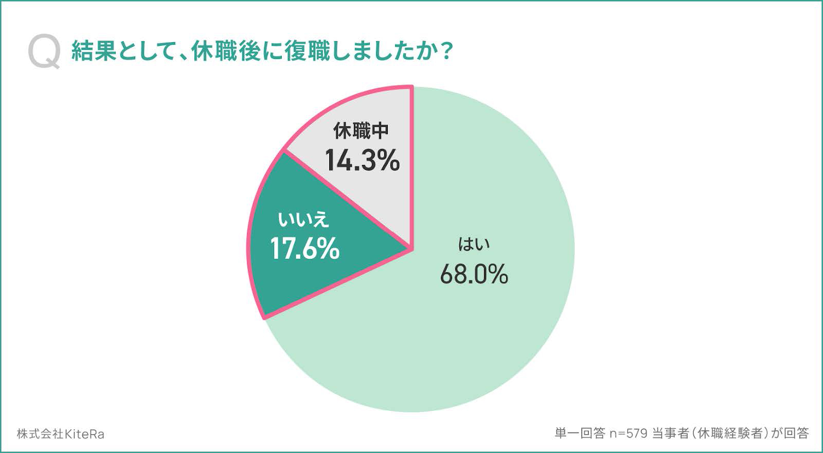 休職経験者に「休職に入った時点で復職したいと考えていましたか」 という質問では、「はい」が65.1%、「いいえ」が34.9%だった。それに加えて「結果として休職後に復職しましたか」という質問では、「はい」が68.0%、「いいえ」が17.6%、「休職中」が14.3%だった。休職後の復職に不安があったかについては、「はい」が90.9%で「いいえ」が9.1%という結果だった。