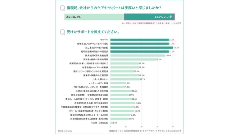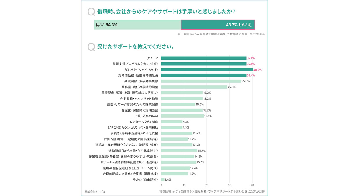休職経験者であり「結果として休職後に復職した人」に、復職時に会社のケアやサポートを手厚いと感じたかについて質問すると、「はい」が54.3%、 「いいえ」が45.7%だった。復職時に会社からのケアやサポートが手厚いと感じた人に、複数回答で「受けたサポートを教えてください」と質問したところ、もっとも多かったのは「試し出社(リハビリ出社)」が40.2%だった。それに「短時間勤務・段階的時間延長」が37.4%、「リワーク」が37.4%、 「復職支援プログラム(社内・外部)」が37.4%だった。回答の上位は、復職の入口整備が中心で「業務量・責任の段階的調整」(29.0%)や評価保護期間(11.7%)など復職後の運用面の調整は低い傾向だった。
