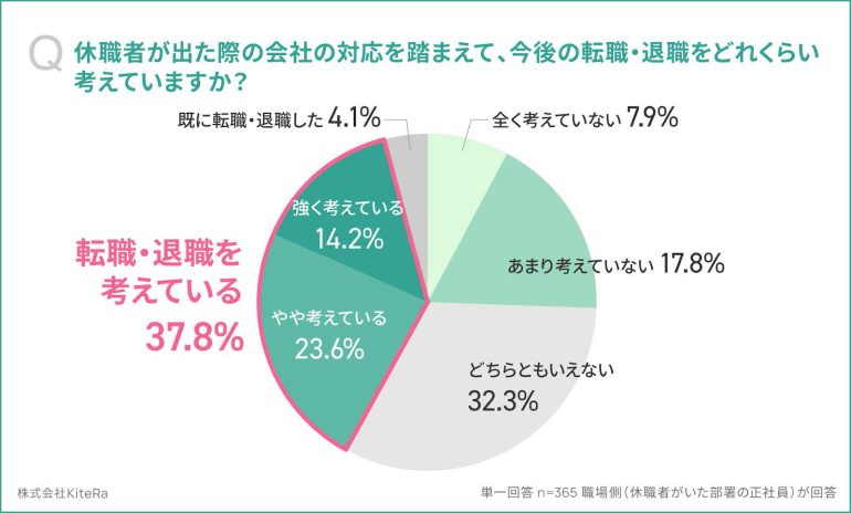 職場側である休職者がいた部署の正社員に、休職者が出た時の会社の対応を踏まえて今後の転職・退職について質問すると、「転職・退職を考えている(やや考えている/強く考えている)」が37.8%、「既に転職・退職した」が4.1%、 「考えていない(あまり考えていない/まったく考えていない)」が25.7%、「どちらともいえない」が32.3%という回答結果になった。4割近くが休職者が出たことで、転職・退職を考えたようだ。