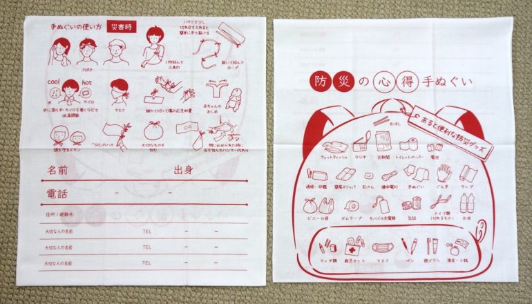 最後に紹介するのが、最近、我が家が導入した、ちょっとした防災用品の「防災手拭い」である(通販で1枚330円)。手拭いは実は多機能で、体拭き、マスク、包帯代わり、枕カバー、頭巾、荷物の包み、赤ちゃんのおしめ、2枚結んで使う三角巾、裂いて結んで伸ばせるロープ、石などを包んで結ぶハンマー代わり・・・など、多岐に役立ってくれるのだ。購入した「防災手拭い」はそうした使い方のイラスト、防災の心得、電話番号、住所、氏名などのメモもプリントされているから活用度は極めて高いと思える。1人1枚は用意したい。