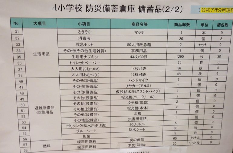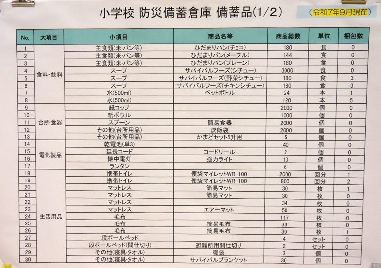 なんとか避難所にたどり着いても、そこからが大変だ。今回、防災訓練で訪れた学校の体育館に設置された避難所の備蓄品一覧を見てみると、避難所を訪れる人数にもよるが、決して潤沢にあるわけではない。実際、「避難時のルール・要請事項」として「避難所の備蓄品は十分でないため、3日間程度の自助対応を要請する」とある。足りない救援物資が届くまでには、さらに時間がかかるだろう。