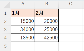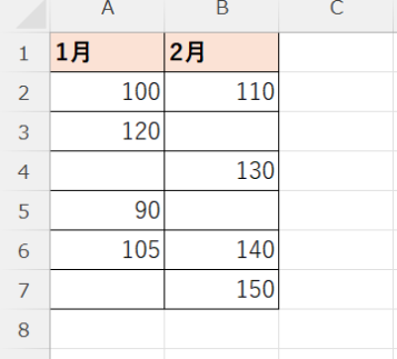 - A2:A4に「1月の売上」B2:B4に「2月の売上」が入力されているとする
