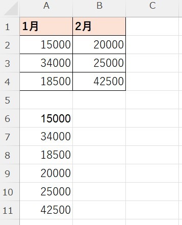 - Enterキーを押すと、2つの範囲が縦方向に結合され1つの一覧として表示される