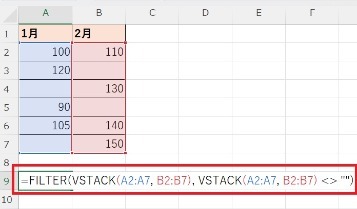 - 任意のセルに=FILTER(VSTACK(A2:A7, B2:B7), VSTACK(A2:A7, B2:B7) <> “”)と入力する