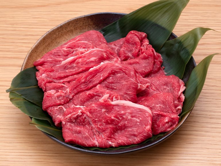 「モモ肉」は脂身が少なく赤身が中心の部位で、あっさりとした味わいが特徴。すき焼きでは赤身本来の旨味が割り下にしっかりと溶け込み、噛むほどに肉の濃厚な味わいが楽しめる。「肩肉」は、脂肪分が少ないほぼ赤身の肉で、肉本来の力強い味が楽しめる。薄切りにして煮ることで、肉の旨味が出汁に溶け込み、濃厚な赤身の旨味が甘辛い割り下と絶妙にマッチして深い味わいがある。