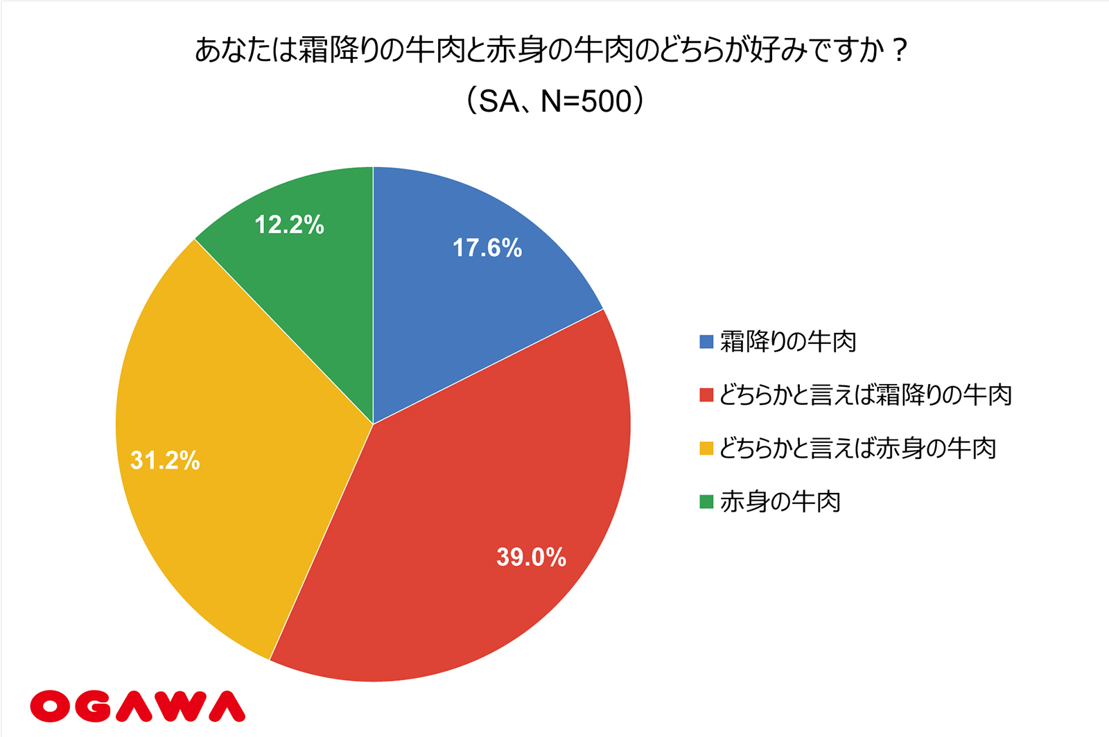 そんな「すき焼き通の日」にちなんで、昭和13年創業の和牛・国産牛豚肉卸の小川畜産食品は、2025年8月に20代から60代の男女500人を対象としたインターネット調査を実施。「霜降りの牛肉」と「赤身の牛肉」のどちらが好みかという質問に対して、「霜降りの牛肉」または「どちらかといえば霜降りの牛肉」と答えた人は全体の56.6%だった。