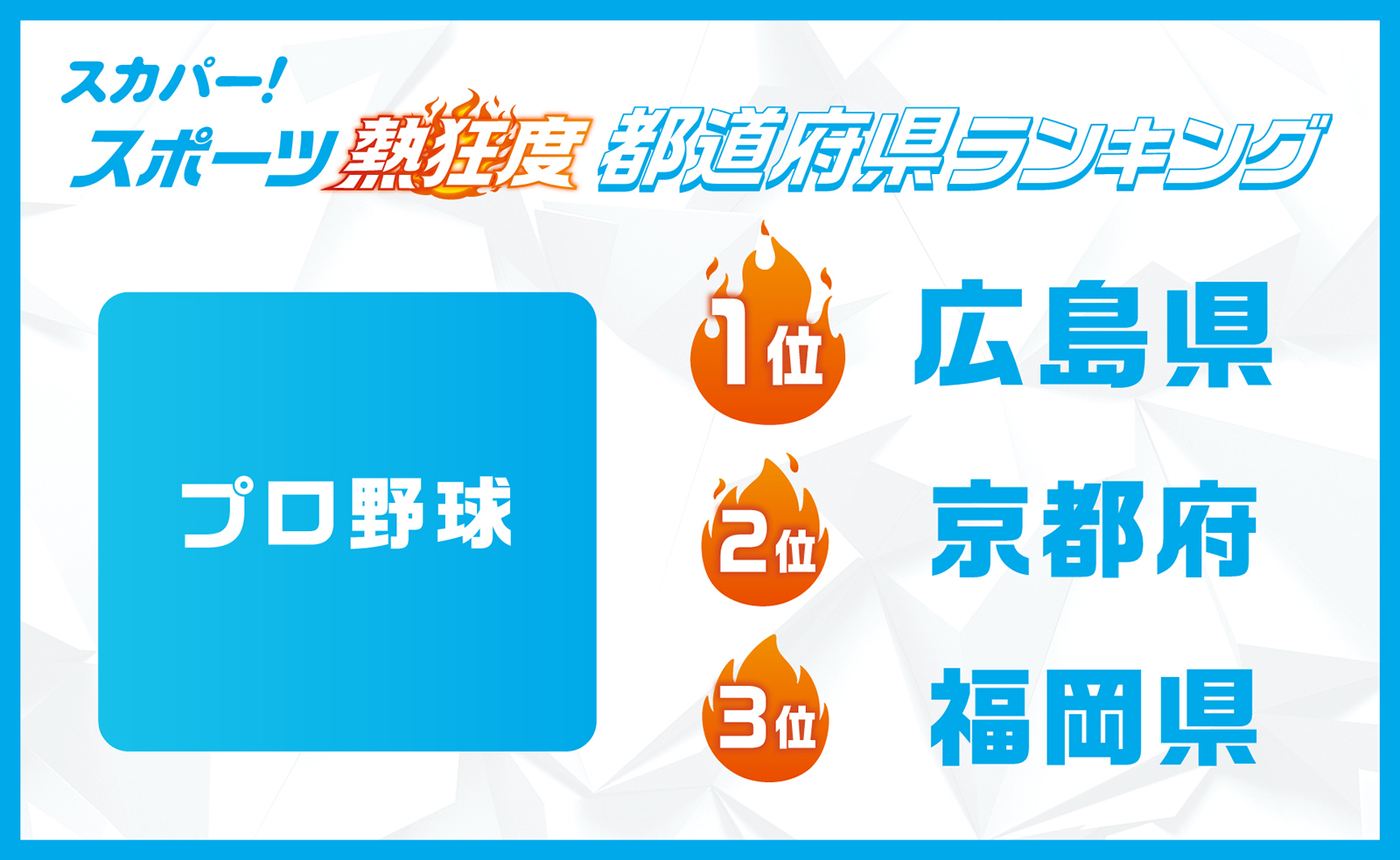 プロ野球は、1位:広島県、2位:京都府、3位:福岡県という結果だった。広島県は、地元球団の広島東洋カープの人気が高く、地上波やローカル紙などでの露出も多く、視聴体験だけでなくファンになる導線が日常的に多い土地柄だ。「費用」、「発信」、「頻度」の3項目すべて高水準で、観戦する理由としても「地元にプロスポーツチームがあるから」(約56.8%)や「地元で試合が開催されるから」(約38.6%)など“カープ熱”が大きな要因になっている。