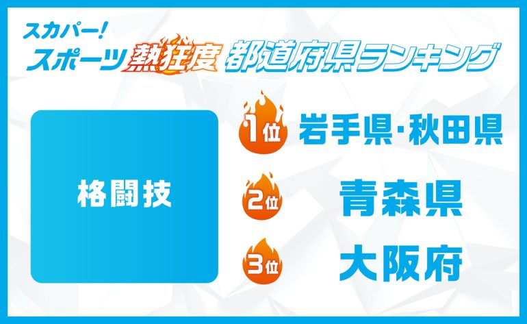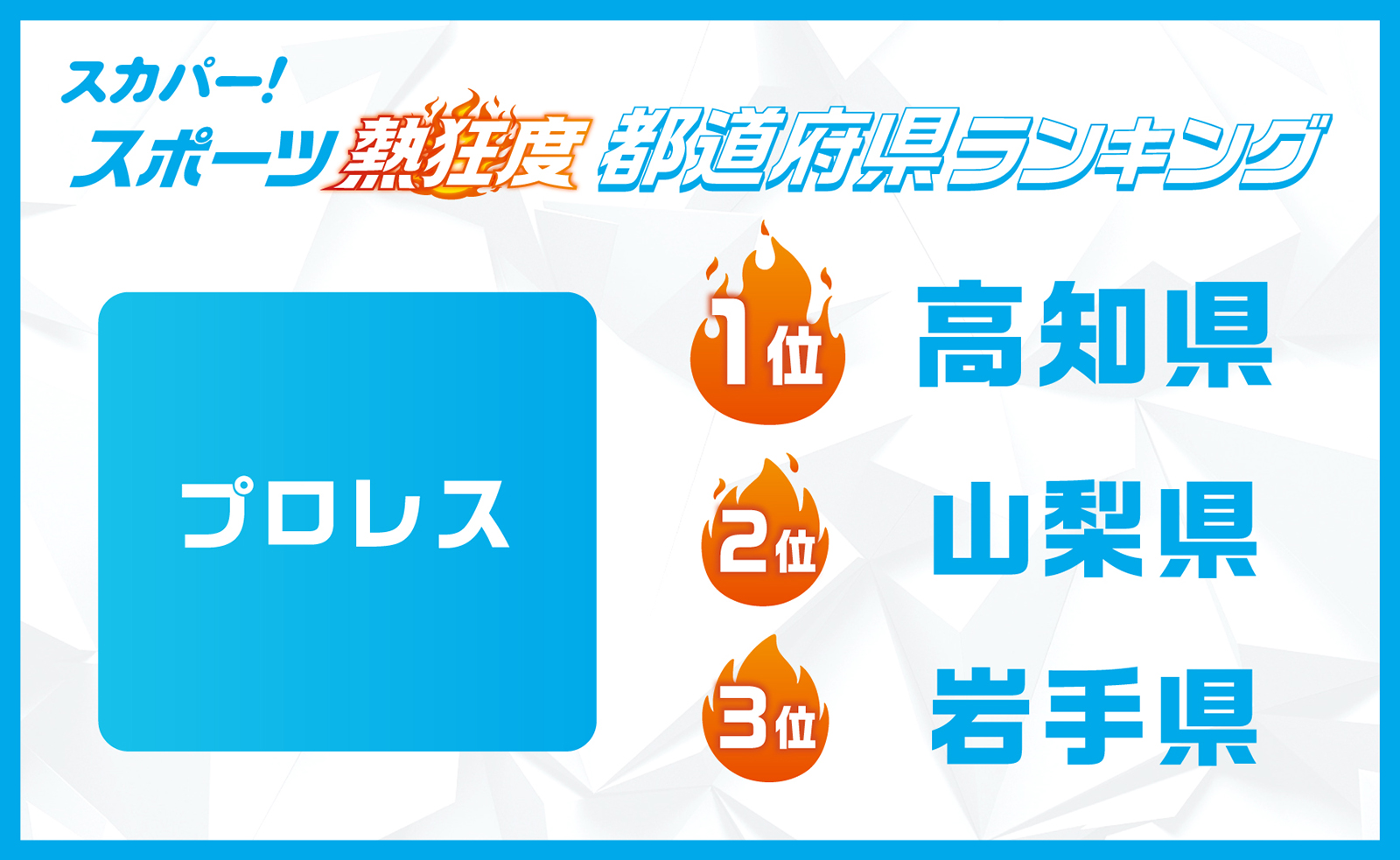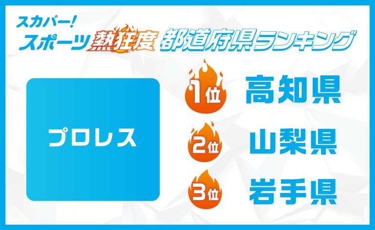 プロレスの熱狂度は、1位:高知県、2位:山梨県、3位:岩手県だった。格闘技は、1位:岩手県と秋田県、2位:青森県、3位:大阪府という結果だった。プロレスで第1位になった高知県は、人気急上昇中の女子プロレスの大会『STARDOM in KOCHI 2025』が開催されるなど、有名選手の参加などが熱狂度を上げた要因と考えられる。格闘技第1位の岩手県は、八重樫東さんなど多くの世界王者を輩出しており、有名選手が多いことが要因といえそうだ。
