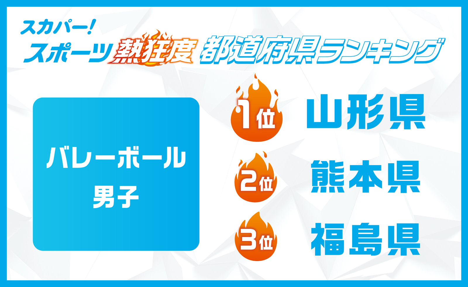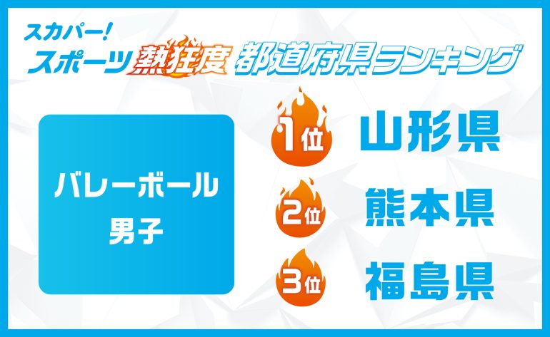 「Vリーグ」がスタートし、男女ともに人気が高まっているバレーボール。男子は、1位:山形県、2位:熊本県、3位:福島県という結果だった。女子は、1位:岐阜県と香川県、2位:青森県と愛媛県、3位:宮崎県という順位になった。男子バレーボール第1位の山形県は、「頻度」、「発信」、「費用」の3項目で平均以上の数値で総合的に熱狂度が高いといえる。女子バレーボール第1位の岐阜県は、Vリーグに所属する「JAぎふリオレーナ」の存在などが熱狂の要因と言えそうだ。