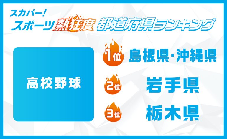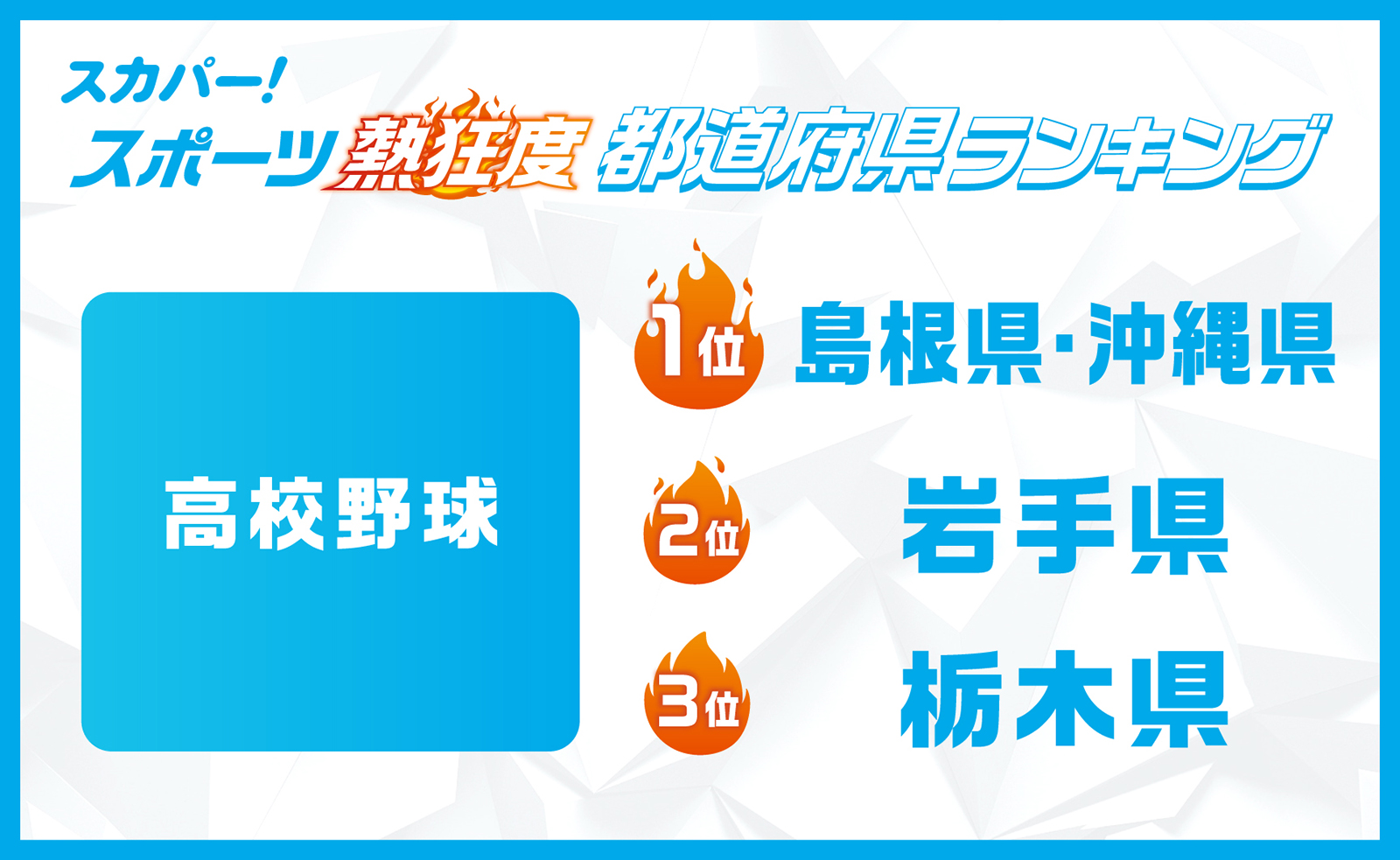 高校野球では、1位:島根県と沖縄県、2位:岩手県、3位:栃木県というプロ野球とは違う結果だった。島根県は、甲子園での島根県代表校の躍進、沖縄県は2025年の甲子園で沖縄県代表校が優勝するなど、地域密着性や甲子園常連校の存在が大きいと思われる。両県ともに「発信」における数値が高く、沖縄県で高校野球を選択した人の観戦する理由では「そのスポーツで感動することが多いから」(約73.3%)と地元の高校球児の活躍に対して熱量の高さが見えた。