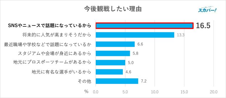 今後観戦してみたい理由では、「SNSやニュースで話題になっているから」(約16.5%)がもっとも多く、地上波で放送がないスポーツでもSNSなどで話題になるスポーツを今後観戦してみたいと思う傾向があるようだ。視聴できるスポーツジャンルは拡大しており、今後は周囲を巻き込める熱狂を生み出すスポーツがファンを獲得していくことになりそうだ。