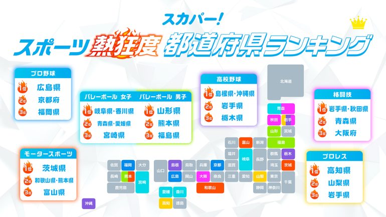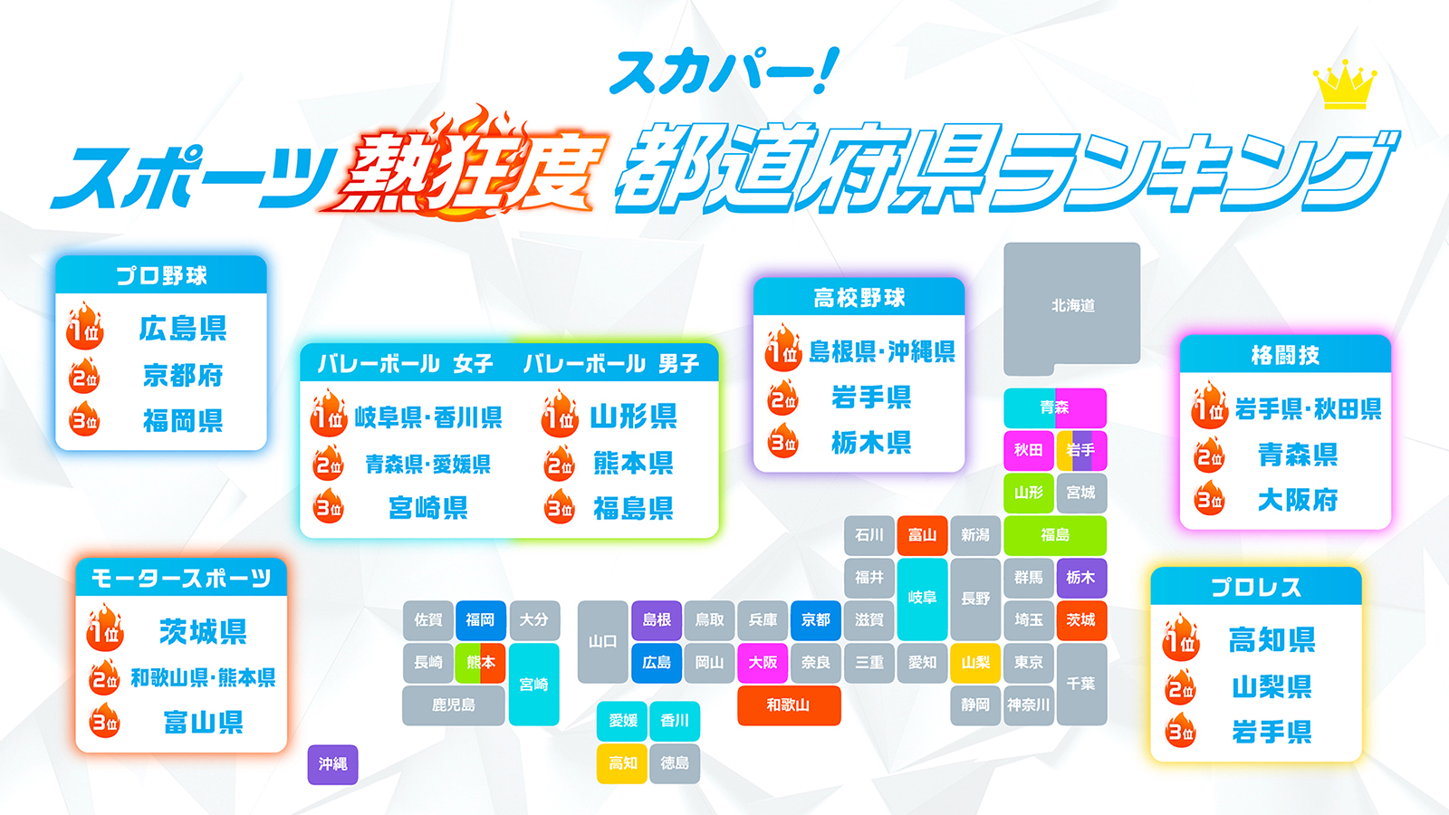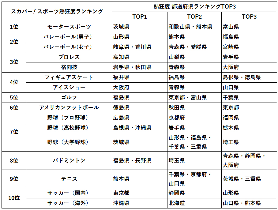 熱狂度は、観戦頻度、SNS・ブログなどでの対外的な発信、観戦にかける費用の3つの項目から算出されている。そこで選ばれたトップ10のスポーツについて、都道府県別のアンケート調査を実施して「スカパー! スポーツ熱狂度 都道府県ランキング 2025」としても発表したが、それによって都道府県によって人気スポーツの違いが見えた。