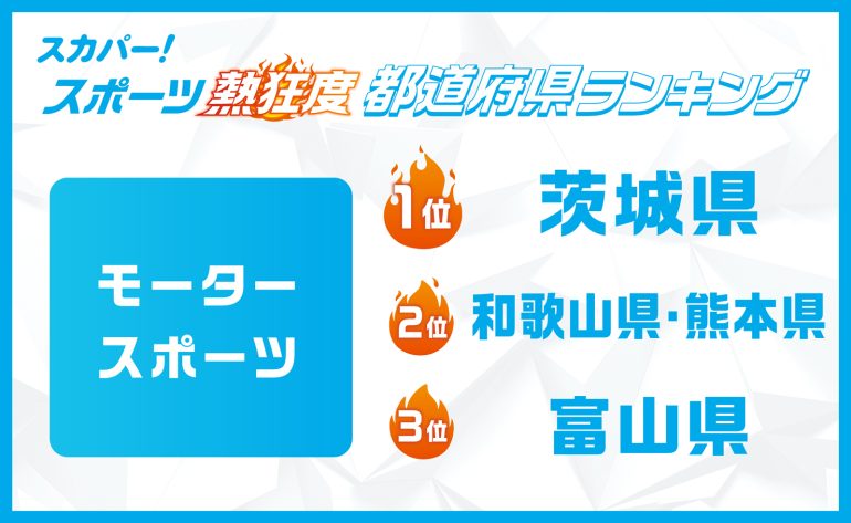 モータースポーツの熱狂度は、1位:茨城県、2位:和歌山県と熊本県、3位:富山県という結果だった。茨城県には、人気のサーキット場の「筑波サーキット」があり、ほかの地域よりもモータースポーツを身近に感じられる環境が大きいと思われる。ちなみにモータースポーツは、近年の人気向上から「スカパー! スポーツ熱狂度ランキング2025」でも1位に輝くなど注目が集まっている。