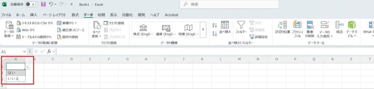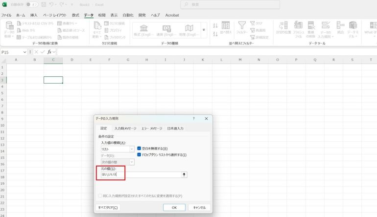 - 「リスト」を選び、元の値欄に「はい,いいえ」などを入力