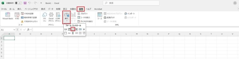 - 「挿入」→「フォームコントロール」内の「チェックボックス」を選択