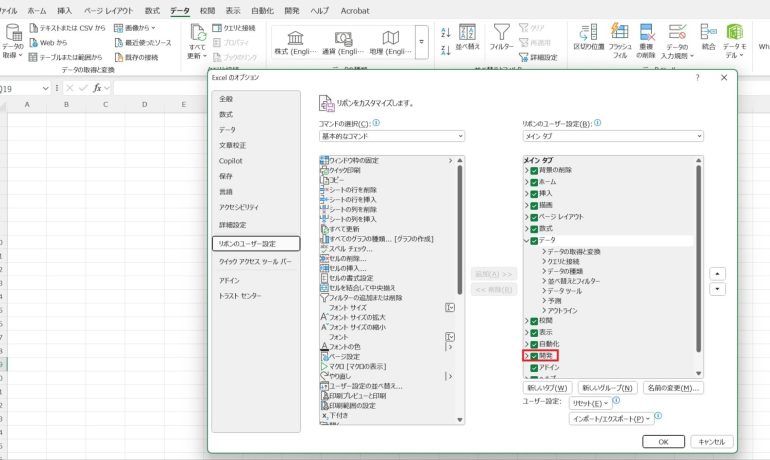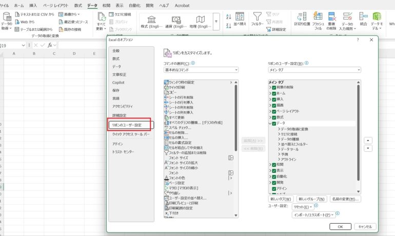 - 「オプション」→「リボンのユーザー設定」を選択する