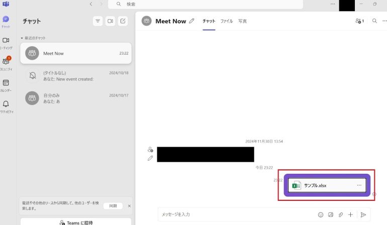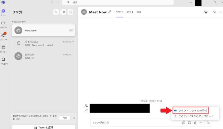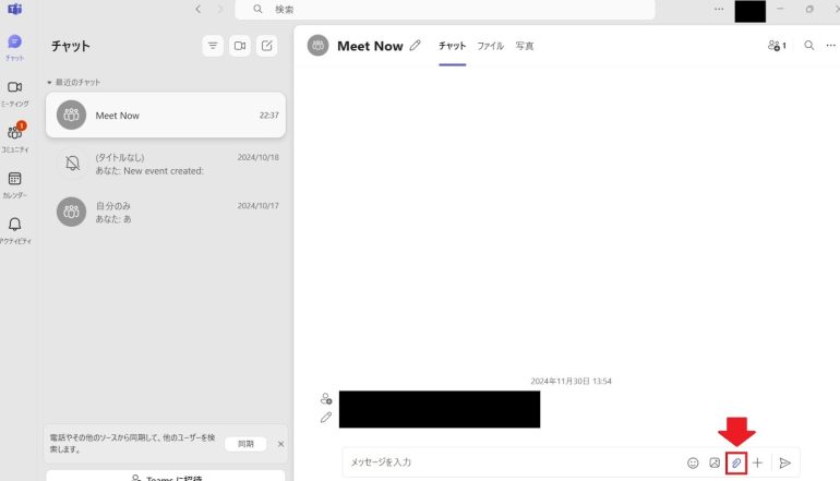 - Teamsのチャットを開き、「ファイルを添付」をクリックする