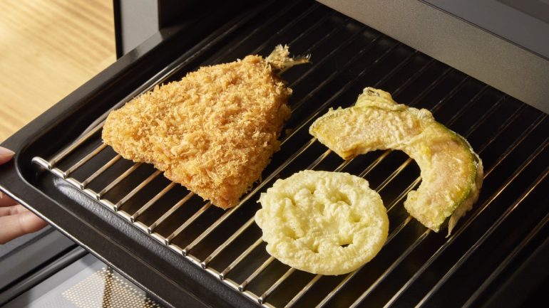 本製品は、庫内容量 20Lのオーブンレンジ。注目ポイントは、上面コンベクションファンとセラミック天板を採用し、惣菜の中でも特にあたため直しが難しい「揚げ物」、「焼き物」を美味しくあたためられる新機能「リフライモード」および「リグリルモード」を搭載しているところ。レンジ対応のセラミック天板に重ねた網に食材を乗せて調理をスタートさせると、選択したモードに合わせてレンジ加熱とオーブン加熱がオートで切り替わり、食材の中まであつあつに、外側は裏までサクサクに仕上げる。