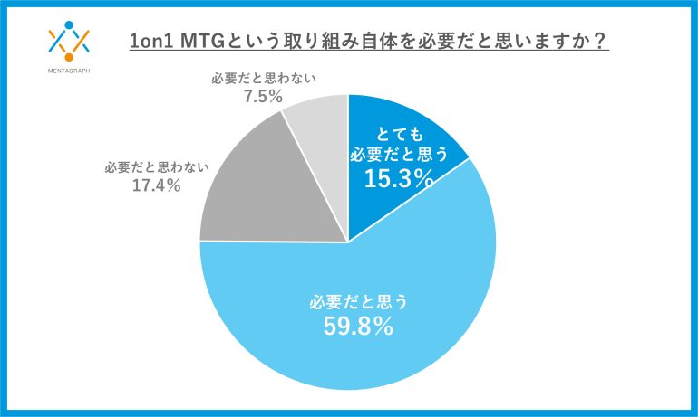 1on1 MTGは必要だと思うか、という質問に対して、75.1%が必要だ(とても必要:15.3%、必要:59.8%)と回答しており、上司も部下も必要性を実感しているという結果に。