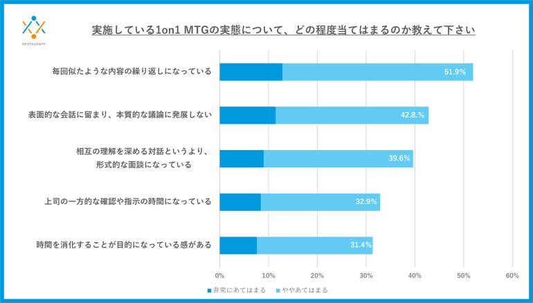 1on1 MTGの実態について調査をした設問においては、全体の51.9%が「毎回似た内容の繰り返しになっている」、42.8%が「表面的な会話に留まり、本質的な議論に発展しない」という項目に「当てはまる」と回答しており、必要と感じながらも実態としては、マンネリ化や形骸化されてしまっていることが判明。