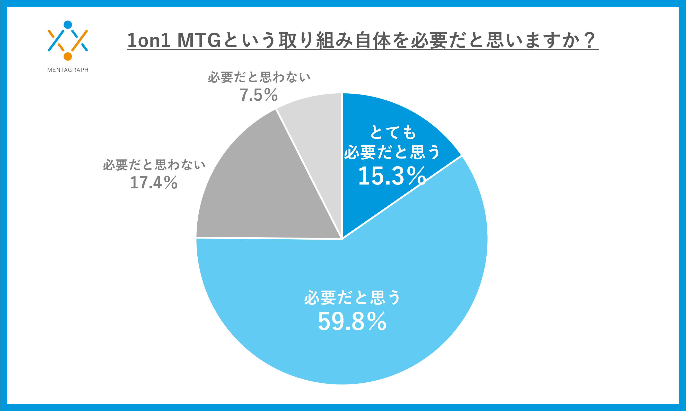 1on1 MTGは必要だと思うか、という質問に対して、75.1%が必要だ(とても必要:15.3%、必要:59.8%)と回答しており、上司も部下も必要性を実感しているという結果に。