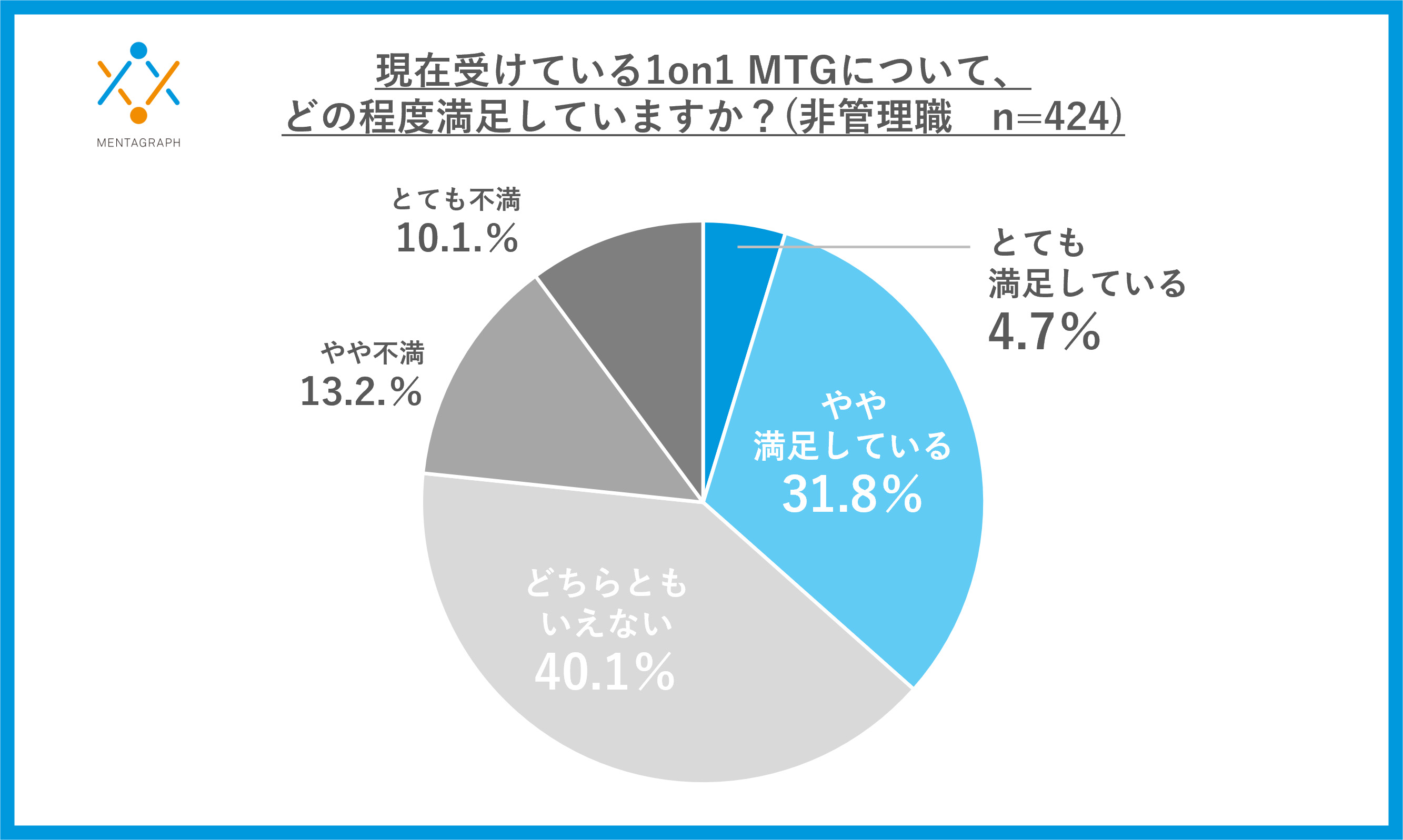 さらに、現在受けている1on1 MTGへの満足度を非管理職に質問したところ、満足しているのは、36.5%(満足:4.7%・やや満足:31.8%)に留まっている。