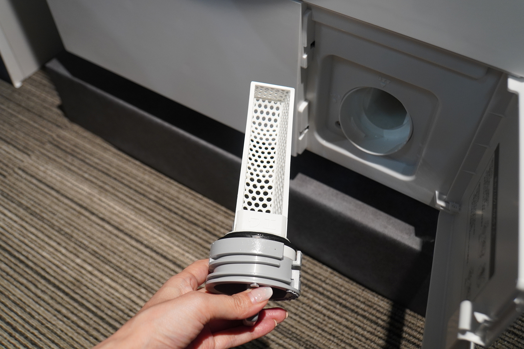 安価なドラム式は排水口に糸くずなどのゴミが流れる簡易構造のフィルターを使用することが多いが、本製品は日本仕様の網型フィルターを採用。見えにくい部分にも配慮が行き届いている点が好印象だった