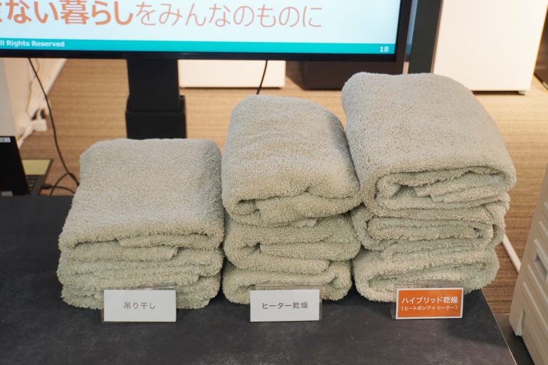 低温風で乾燥させるため、ヒーター乾燥よりもタオルがふっくら仕上がるというメリットも。写真は吊り干しで自然乾燥させたタオル(写真左)、ヒーター乾燥させたタオル(写真中央)、新製品で乾燥させたタオル(写真右)の比較