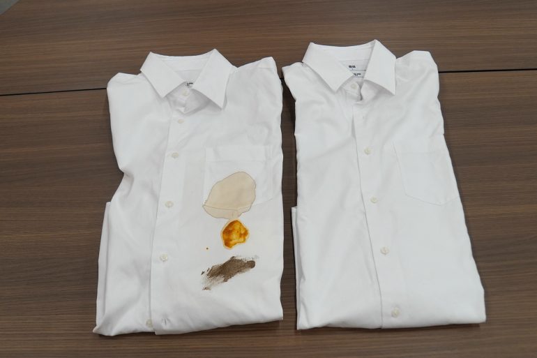 シャツを同じように汚して片方だけ新製品で洗ったもの。汚れは上から醤油、ケチャップ、泥の3種類。左が洗濯前、右が洗濯後のシャツ