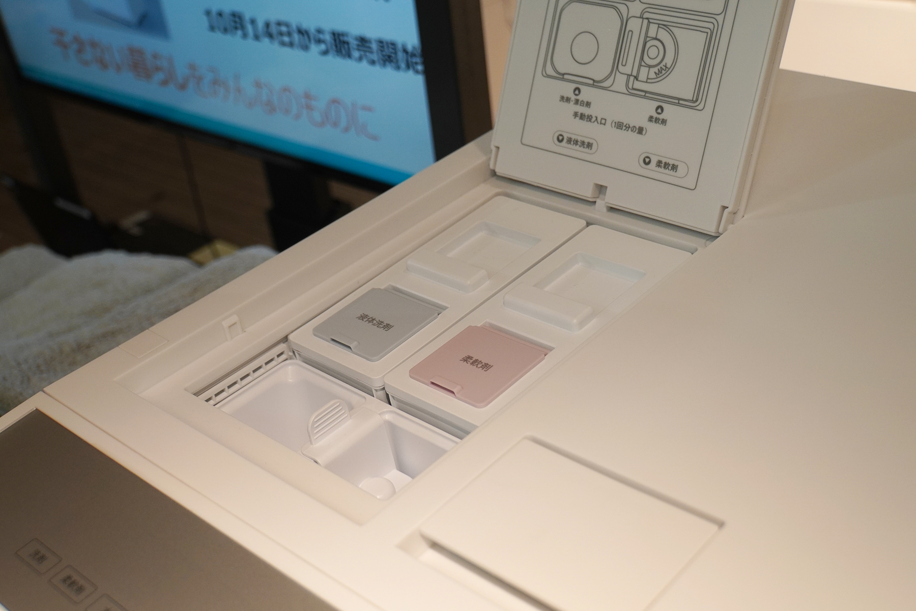 もちろん洗剤・柔軟剤自動投入機能も搭載。洗剤は1000ml、柔軟剤は600mlまでまとめて投入でき、洗濯のたびに必要量が注入される