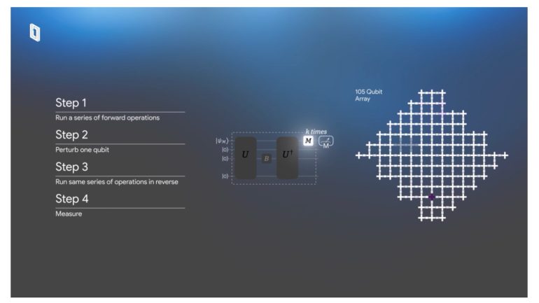 まず、量子システム(Willow チップ上の量子ビット)に綿密に作りこんだ信号を送り、1 つの量子ビットに摂動を加え、その後、その時間発展を正確に逆方向に戻すことで、返ってくる「エコー(こだま)」を観測する。