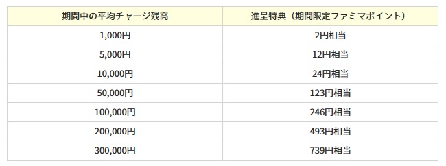ちなみに、「キャンペーン開始前にチャージをした残高であっても、キャンペーン期間中にチャージ残高としてファミペイ内に入っている残高は、当該期間の平均チャージ残高の計算対象」なので、すでにある程度の額がチャージされているなら、その額に応じてボーナスがもらえる点もいい。
