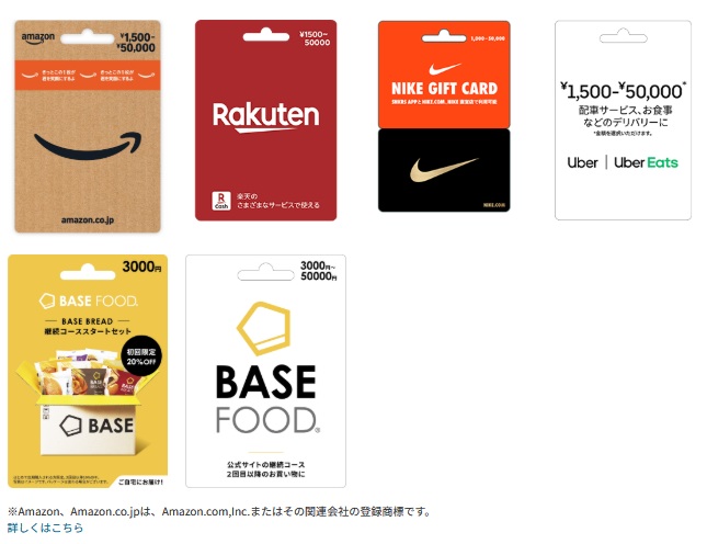 AmazonギフトカードはAmazon.co.jpで商品購入に使えるプリペイドカード、そして、楽天ギフトカードは電子マネー「楽天キャッシュ」を受け取ることができるギフトカードだ。