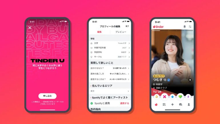 Tinderのアプリ内機能「Tinder U」は大学生向けに設計されたサービスだ。Tinderアカウントを作成した後に、大学のメールアドレスを認証することで、通っている大学や学部、サークルなどの情報をプロフィールに追加できるようになる。同じ大学や共通の趣味を持つ近隣の学生と簡単につながれるとして人気の機能だ。