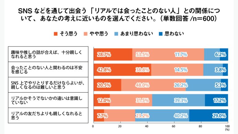 コロナ禍以降の生活・学習環境・価値観などが当たり前になっている2002~2010年生まれ(22~15歳)を対象に、「SNSなどを通じて出会う“リアルでは会ったことのない人”との関係について、あなたの考えに近いものを選んでください」と質問したところ、「趣味や推しの話が合えば、十分親しくなれると思う」と答えた人(「そう思う」「ややそう思う」の合計)は82.2%に上った。