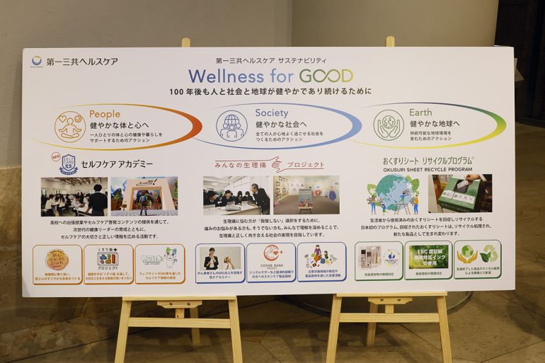 第一三共ヘルスケアは今年6月、サステナビリティ活動の新たなコンセプト「Wellness for GOOD」を宣言。「100年後も人と社会と地球が健やかであり続けるために」というステートメントを定め、「People-人-」「Society-社会-」「Earth-地球-」の3つの領域において取り組みを実施することを発表した。