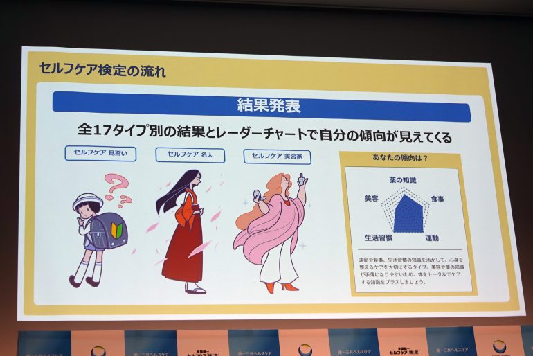「セルフケア検定」は薬の知識、食事、運動、生活習慣、美容の5つのカテゴリで構成される。パソコンやスマホから無料で受験でき、全15問の設問に答えることで、自身のセルフケア力を確認できるというもの。結果は解説付きで、パラメータの形で自身の得意、不得意といった傾向についても表示される。検定結果に応じて17タイプのキャラクターに分類されるのも楽しい。