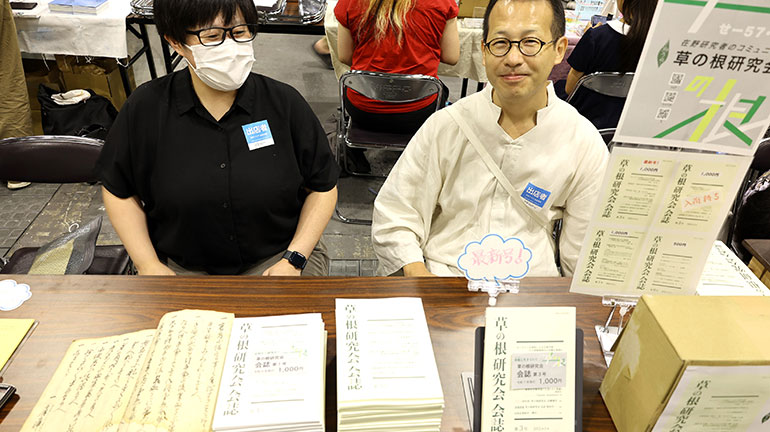 次は、「草の根研究会」のブース。古文書や歴史の愛好家たちが集まった研究会だそうで、年1回発行の会誌を販売していた。