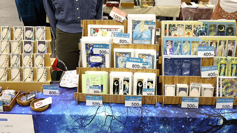 青を基調としたアールヌーボー風のデザインが美しく、たくさんの人が足を止めていた。文学フリマに限らず、同人が集うマーケットには精力的に出店しており、多くのファンがいるようだ。