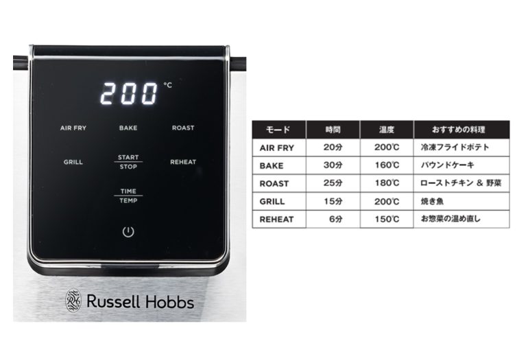 また、「AIR FRY」「BAKE」「ROAST」「GRILL」「REHEAT」の5種類の調理モードを搭載し、それぞれのモードに温度・時間が設定されているので、難しい操作をする必要なく使用することが可能。もちろん、好みに合わせて、温度(60~200度の間で5度単位)と時間(1~60分の間で1分刻み)を設定することもできる。