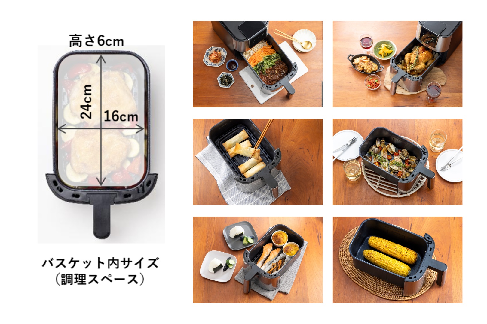 そんな同製品の特長は、高温熱風循環式を採用し、効率よく短時間で調理ができるところ。しかも、油を使わず、または少ない油で調理可能で、水を入れればヘルシーな「蒸し料理」も作ることができる。
