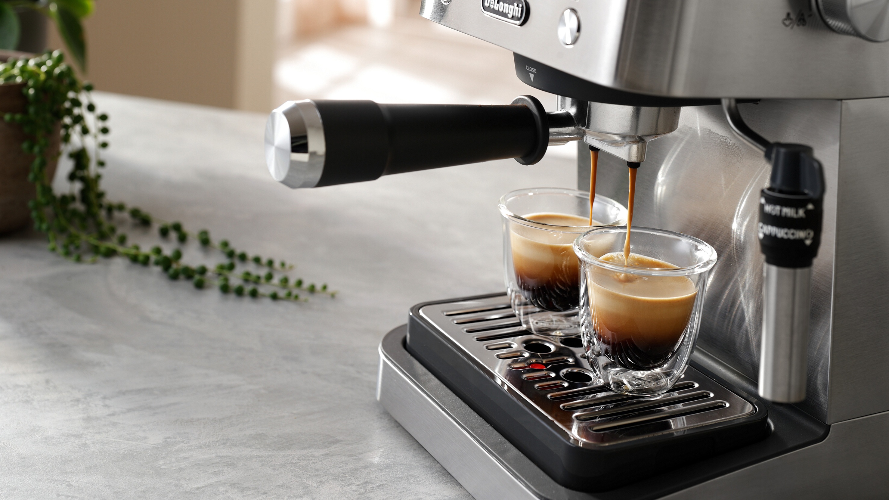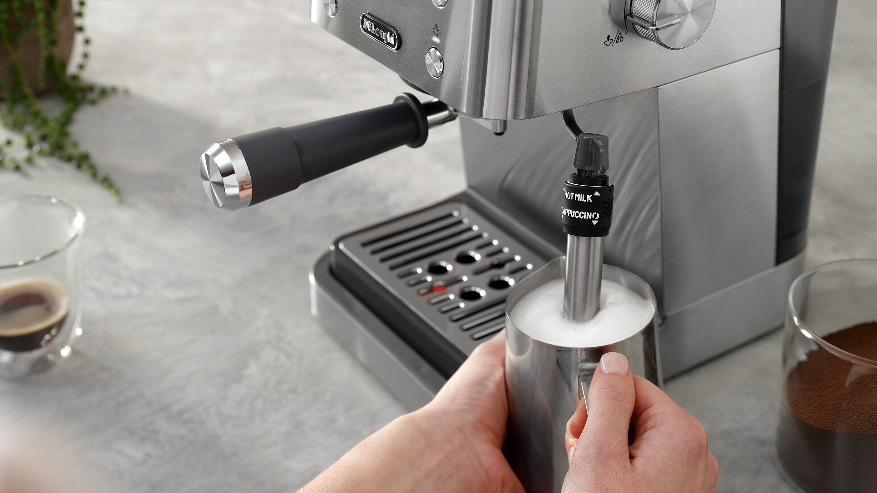 「クラシック エスプレッソ・カプチーノメーカー(EM450J-M)」は、本格的なエスプレッソ抽出や、自分好みのフォームミルクの調節、シンプルな操作性から、自分の手で淹れる愉しみを簡単に味わえるエントリーモデル。